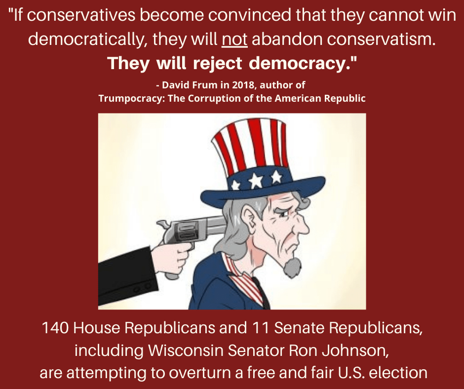 Yet even with no evidence, with hand and machine recounts verifying the accuracy of the election results, with state Election Commissions made up of both Republicans and Democrats and both Republican and Democratic Governors certifying the accuracy of Joe Biden’s win, Republicans in the House and Senate, including Ron Johnson, have indicated they will attempt to overthrow the will of the people and place their candidate in the White House instead of the democratically elected winner, Joe Biden.