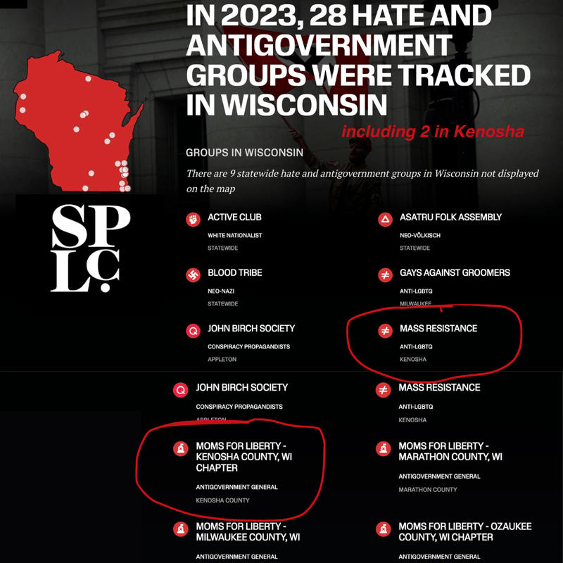 Kenosha Moms for Liberty has attempted to ban books dealing with LGBT content from public schools and public libraries and engaged in other activities harmful to the community.