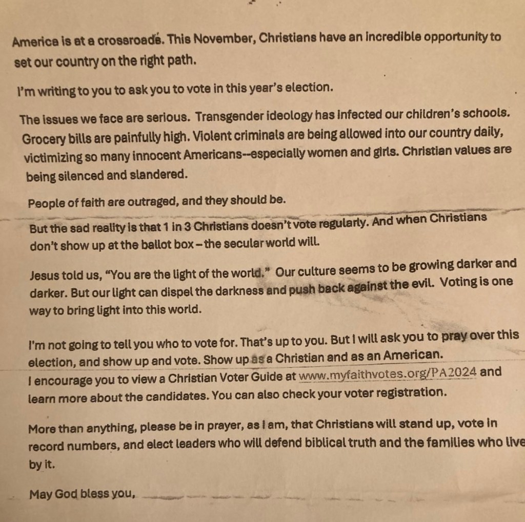 The people who illegally placed these letters into mailboxes throughout Kenosha County are showing us they support religious zealotry and want to establish a Christian Nationalist form of government.